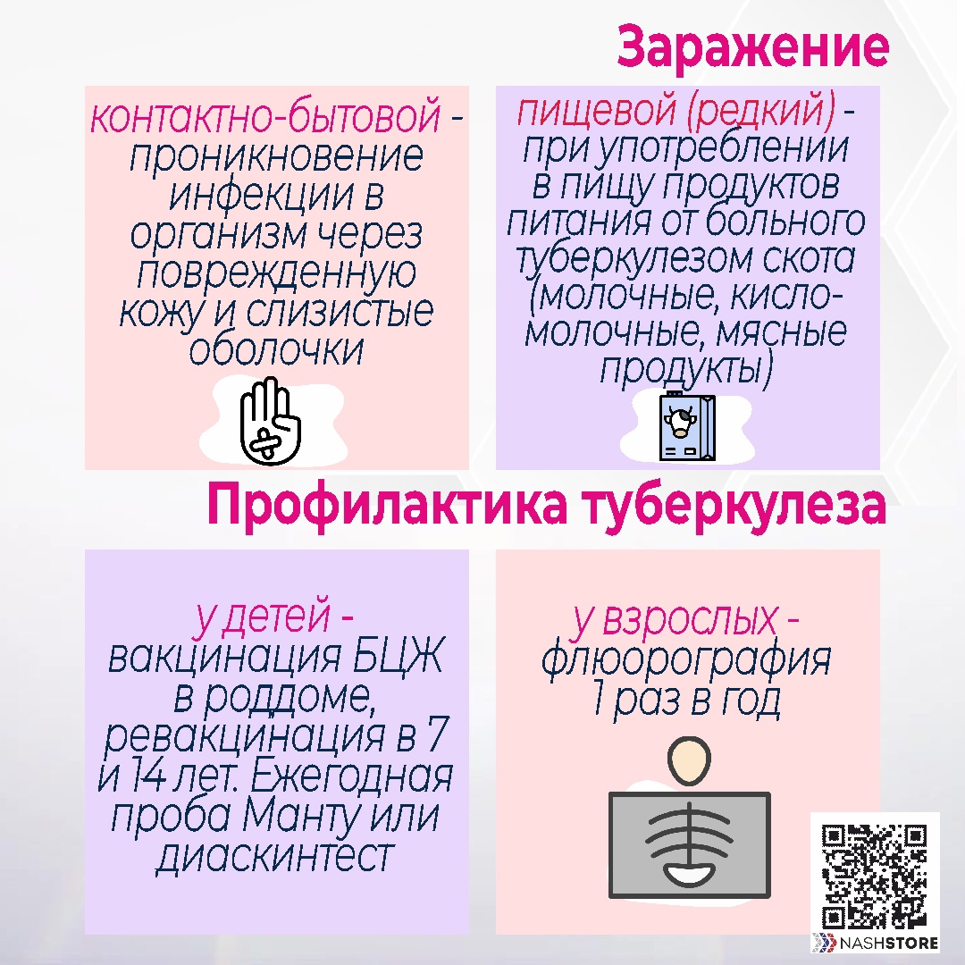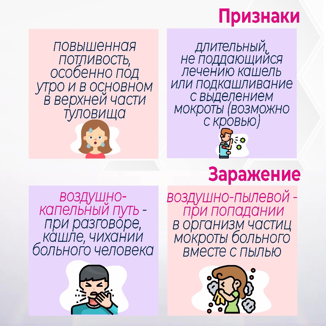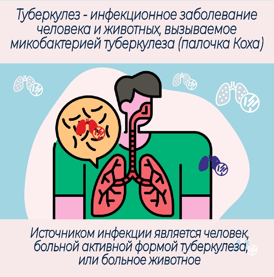 Туберкулез-инфекционное заболевание человека и животных, вызываемое микобактерией туберкулеза (палочка Коха). Источником инфекции является человек, больной активной формой туберкулеза или больное животное. Как не заболеть туберкулезом? Подробнее в наших карточках.